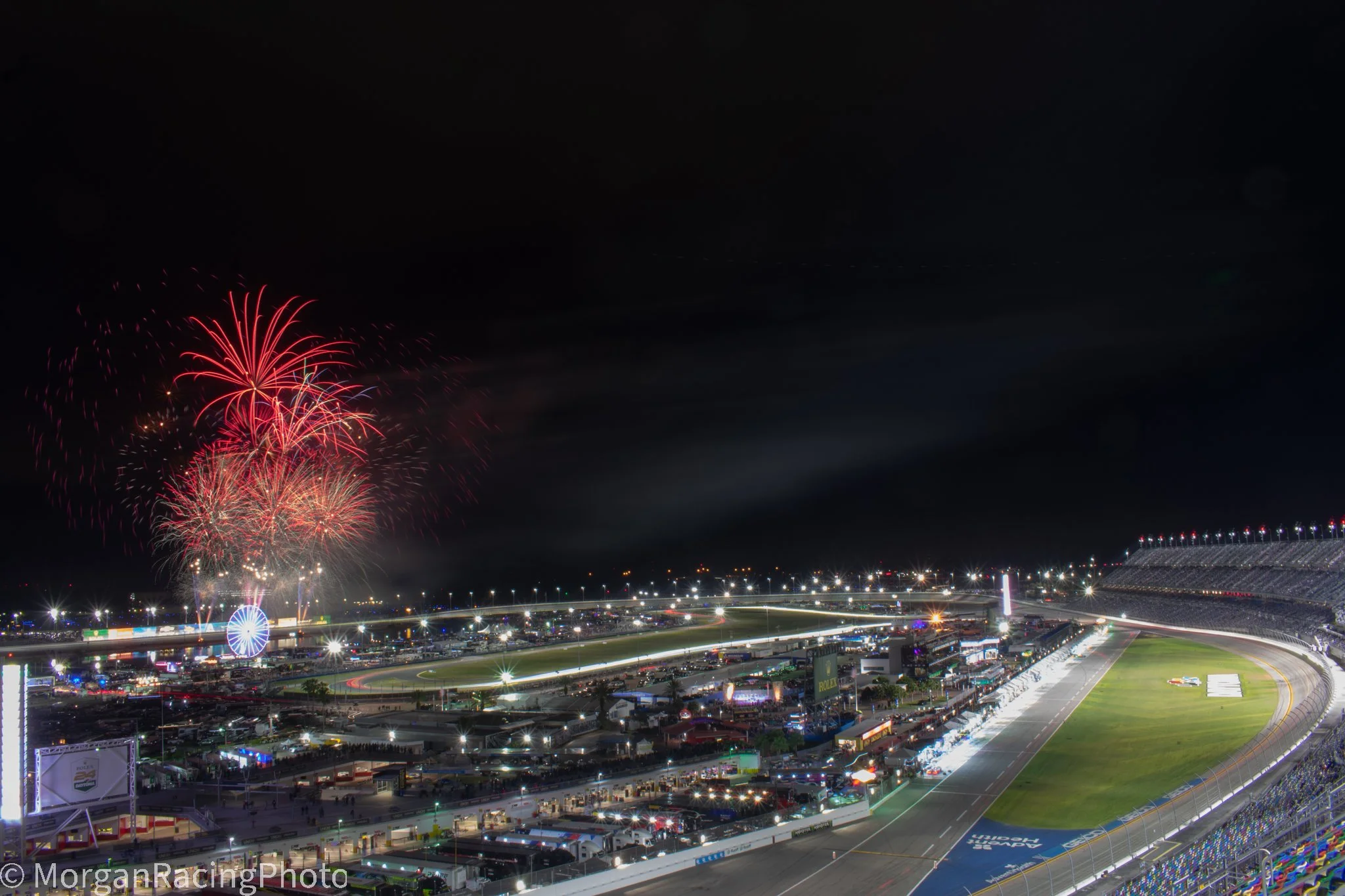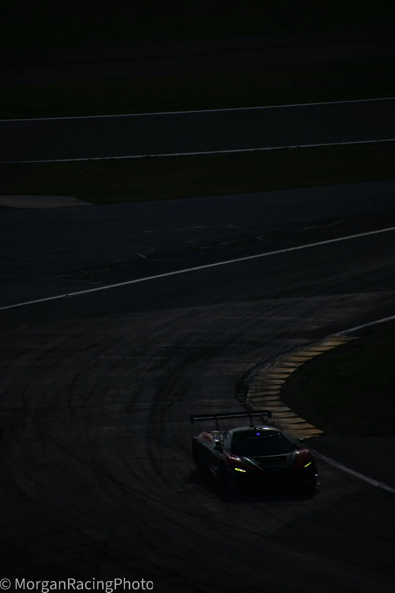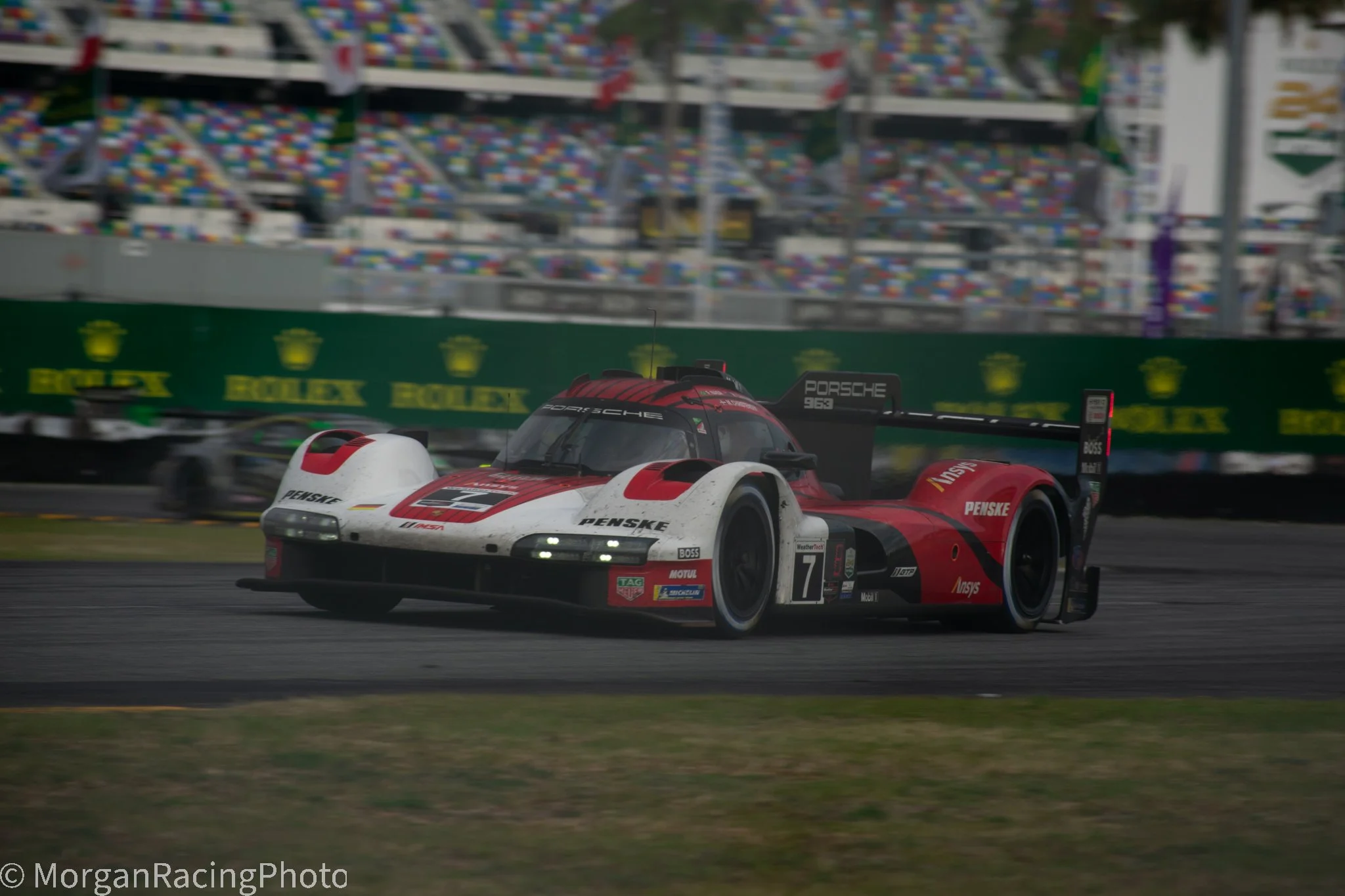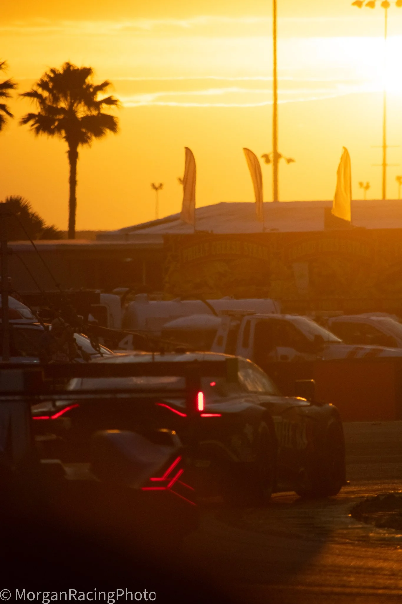 Early morning shadows cast on the #60 Meyer Shank Racing Acura Lmdh, on its way to winning the 2023 Rolex 24 hours of Daytona